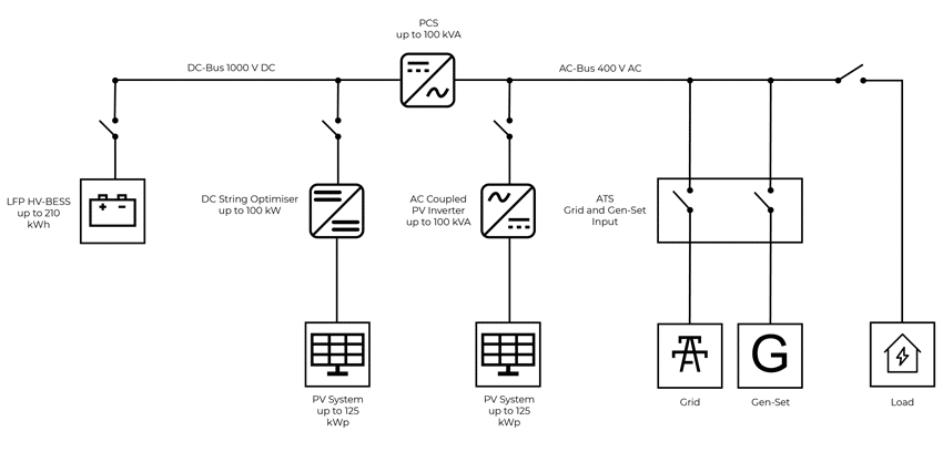 Skalierbare Einheiten von 135 kWh bis hin zu MWh. Einheiten arbeiten parallel oder unabhängig voneinander.